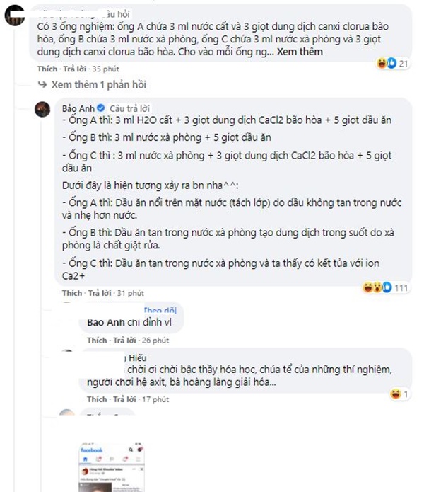 Ngay lập tức câu trả lời cụ thể và chính xác của Bảo Anh đã khiến cư dân mạng vô cùng sững sờ. Ai nấy vô cùng bất ngờ trước kiến thức hóa học của nữ ca sĩ và thi nhau khen ngợi: “Trời ơi, bậc thầy hóa học, chúa tể của những thí nghiệm, người chơi hệ axit, bà hoàng làng giải hóa…:”, “Chị đỉnh quá!”, “Khi chị dân chuyên Hoá mà mẹ bắt làm ca sĩ.”