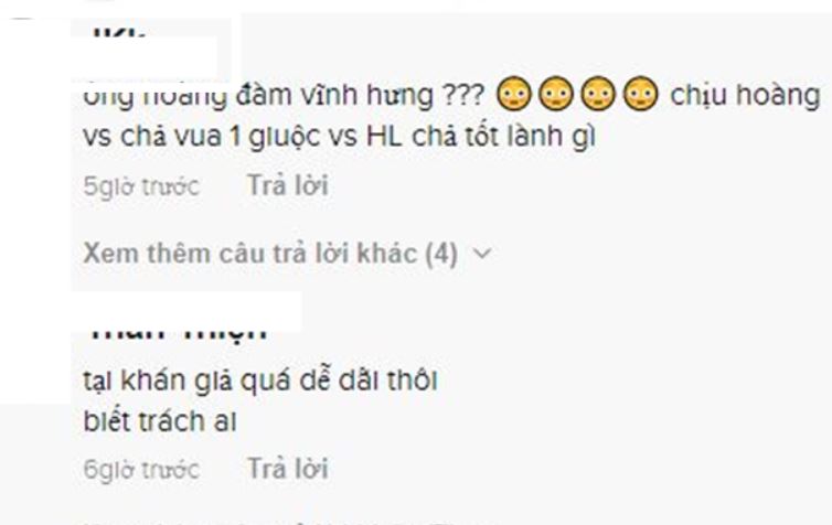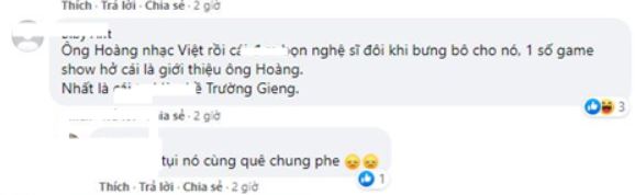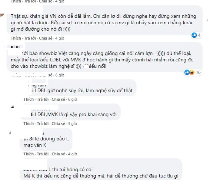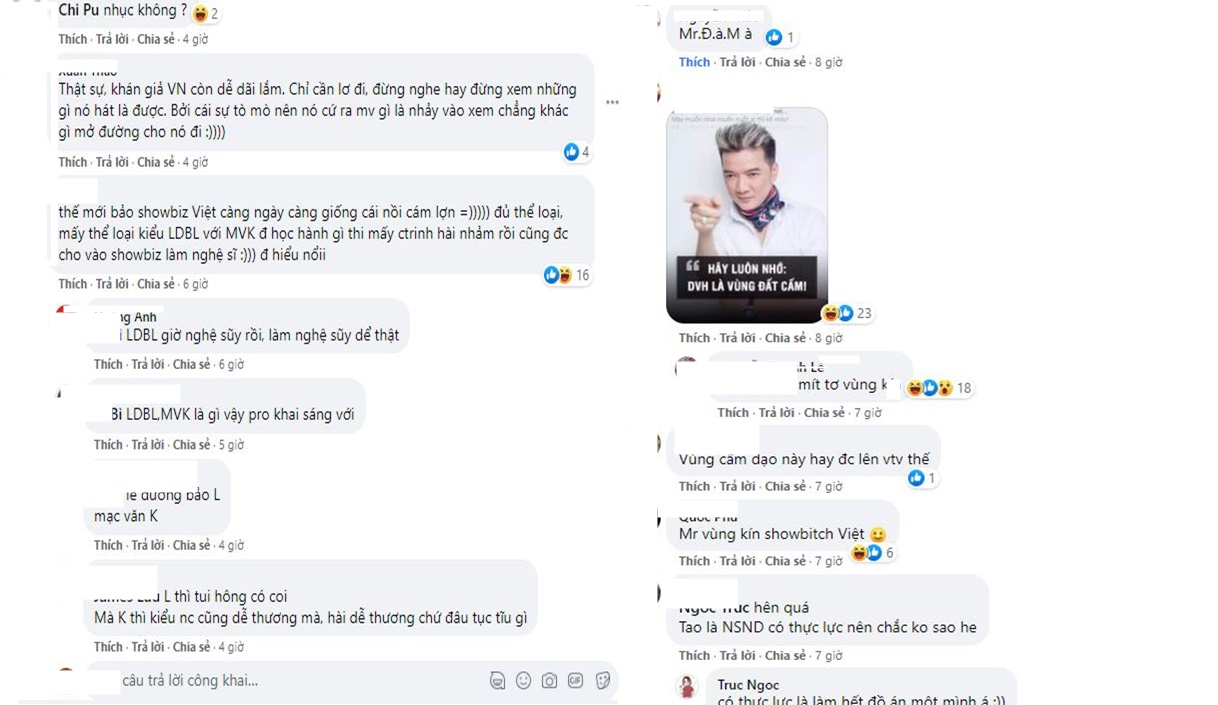 Hàng loạt bình luận gọi tên và chỉ trích nhiều nghệ sĩ khác: "ông hoàng Đàm Vĩnh Hưng, cùng 1 ruột với Hoài Linh!...", "Ông Hoàng nhạc Việt nhiều nghệ sĩ đôi khi bưng bô cho nó, 1 số gameshow hở cái là giới thiệu ông Hoàng. Nhất là Trường Giang", "Thế mới bảo showbiz Việt càng ngày càng giống cái nồi cám lợn, đủ thể loại, mấy thể loại kiểu Lê Dương Bảo Lâm với Mạc Văn Khoa thi mấy cái chương trình hài nhảm rồi cũng được cho vào showbiz làm nghệ sĩ , không hiểu nổi!"