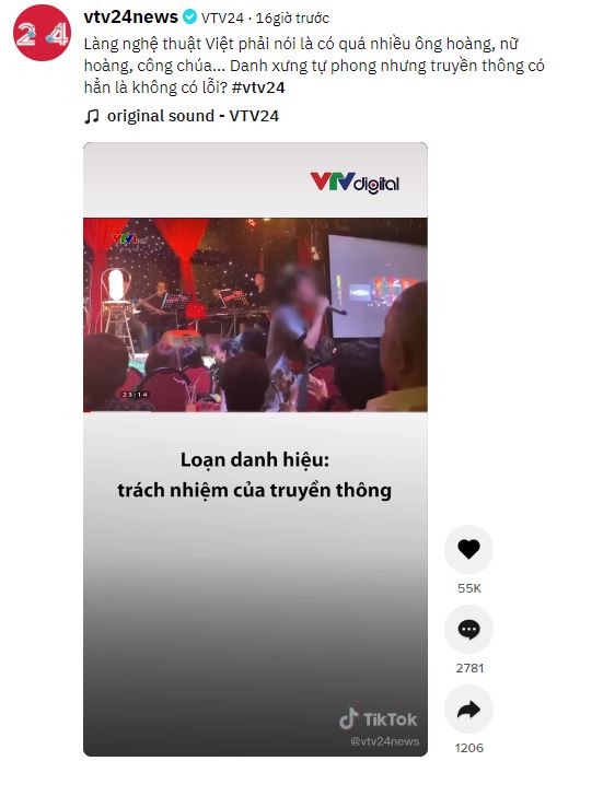 Mới đây, tối ngày 8/7, bản tin của kênh VTV1 đã nhắc đến vấn đề ‘loạn danh hiệu’ và đề cập đến một nam ca sĩ có danh xưng ‘ông hoàng nhạc Việt’ nhưng lại có những hành động không đúng chuẩn mực của nghệ sĩ.