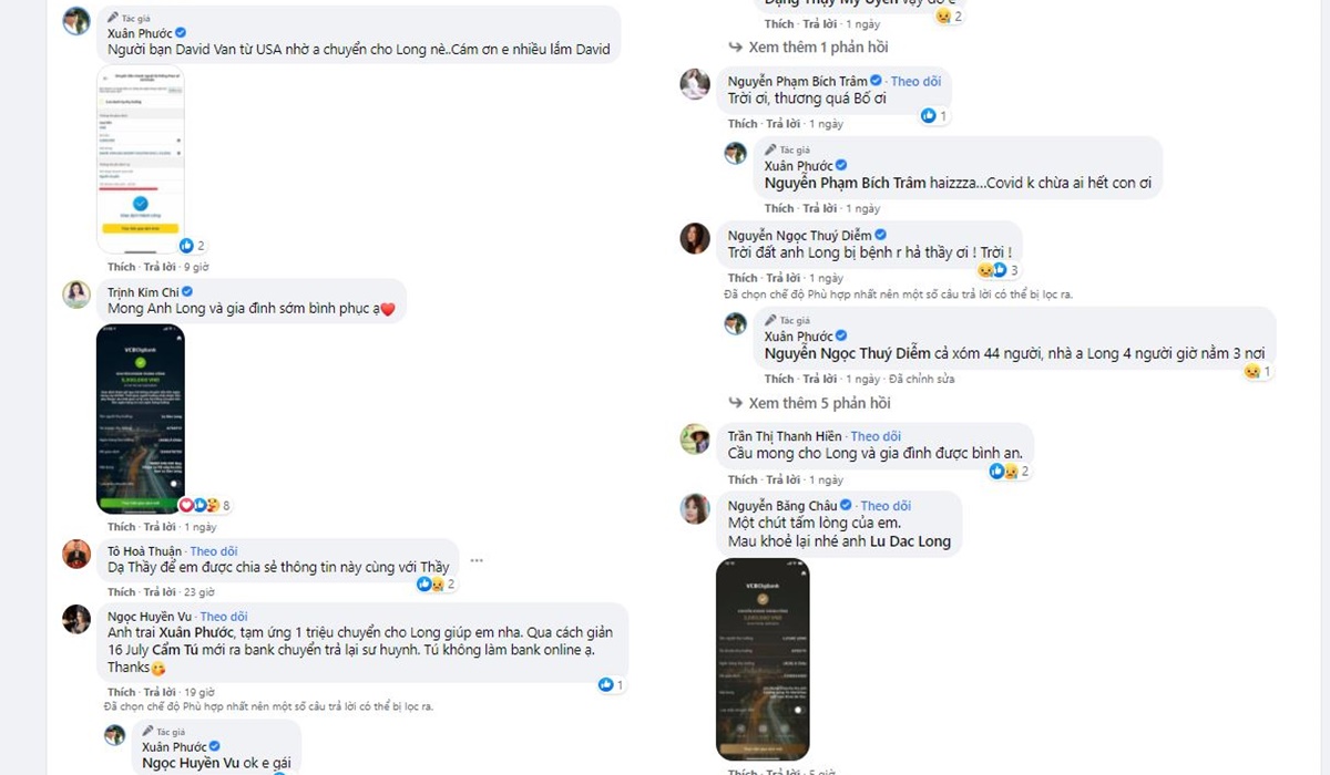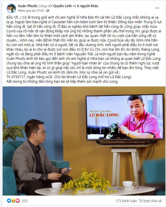 “BẦU ƠI...! Có lẽ trong giới anh chị em Nghệ Sĩ-Nhà Báo thì cái tên Lữ Đắc Long chắc không ai xa lạ gì. Ngoài làm báo,nghệ sĩ Cascader hắn còn kiêm luôn làm từ thiện. Đồng bào miền Trung lũ lụt hắn cũng đi, Sạt lở hắn cũng đi. Ở đâu ai nghèo khó bệnh tật hắn cũng đi, cũng giúp. Mấy mùa Covid vừa rồi hắn đi vận động khắp nơi ủng hộ những thành phần yếu thế trong XH, giúp được ai hắn vui lắm, hắn làm từ thiện một cách âm thầm, lạc quan. Riết rồi nụ cười của hắn cũng rất có duyên... Hôm nay, Hắn BỆNH thật rồi! Hắn ko giúp ai được nữa. Covid bủa vây lấy Xóm nhà hắn- ko còn sót một ai. Nhà hắn có 4 người, tất cả đều dương tính, mỗi người phải điều trị ở một nơi khác nhau, ko ai lo cho ai được (vợ con điều trị ở BV Củ Chi, con trai lớn BV An Bình). Riêng Long ngất xỉu và đang phải điều trị ở Bệnh Viện Nguyễn Trãi. Là một người bạn lâu năm trong nghề Xuân Phước kính lời kêu gọi đến anh chị em Nghệ sĩ-Nhà báo và những ai quen biết Lữ Đắc Long chung tay chia sẻ ủng hộ tinh thần giúp "người bạn nhân ái" của chúng ta có thêm nghị lực vượt qua khó khăn hiện tại. Ai có gì giúp nấy (dù chỉ là một dòng tin nhắn) để bạn ấm lòng.”