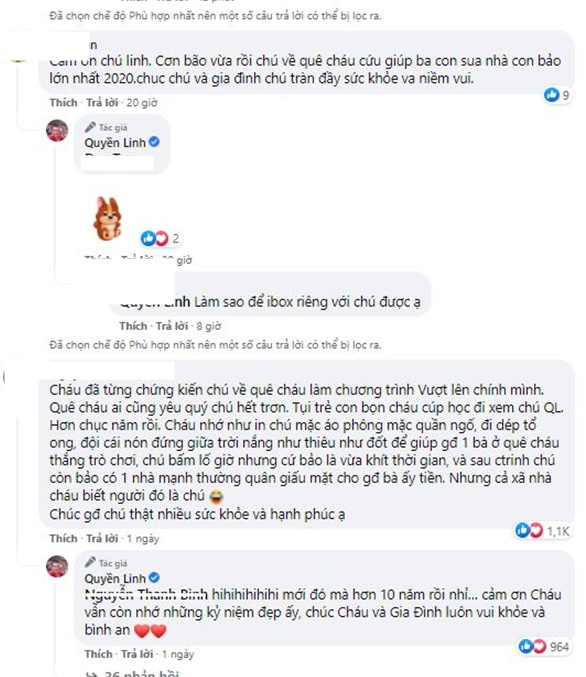 Nhiều bình luận tiết lộ những hành động cảm động được nam MC thực hiện âm thầm: “Cảm ơn chú Linh. Cơn bão vừa rồi chú về quê cháu cứu giúp ba con sửa nhà con, bão lớn nhất 2020. Chú và gia đình chú tràn đầy sức khỏe va niềm vui.”, “Cháu đã từng chứng kiến chú về quê cháu làm chương trình Vượt lên chính mình. Quê cháu ai cũng yêu quý chú hết trơn. Tụi trẻ con bọn cháu cúp học đi xem chú QL. Hơn chục năm rồi. Cháu nhớ như in chú mặc áo phông mặc quần ngố, đi dép tổ ong, đội cái nón đứng giữa trời nắng như thiêu như đốt để giúp gđ 1 bà ở quê cháu thắng trò chơi, chú bấm lố giờ nhưng cứ bảo là vừa khít thời gian, và sau ctrinh chú còn bảo có 1 nhà mạnh thường quân giấu mặt cho gđ bà ấy tiền. Nhưng cả xã nhà cháu biết người đó là chú!