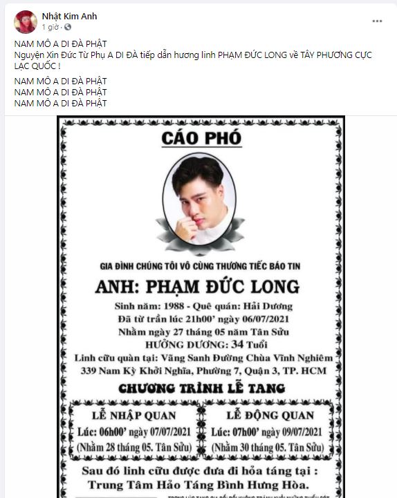 Cũng vào tối 7/6, nữ ca sĩ Nhật Kim Anh đã vô cùng thương tiếc đăng tải hình ảnh cáo phó của cố diễn viên Đức Long trên trang cá nhân cùng với những lời cầu nguyện đầy xót xa: “NAM MÔ A DI ĐÀ PHẬT! Nguyện Xin Đức Từ Phụ A DI ĐÀ tiếp dẫn hương linh PHẠM ĐỨC LONG về TÂY PHƯƠNG CỰC LẠC QUỐC ! NAM MÔ A DI ĐÀ PHẬT”.