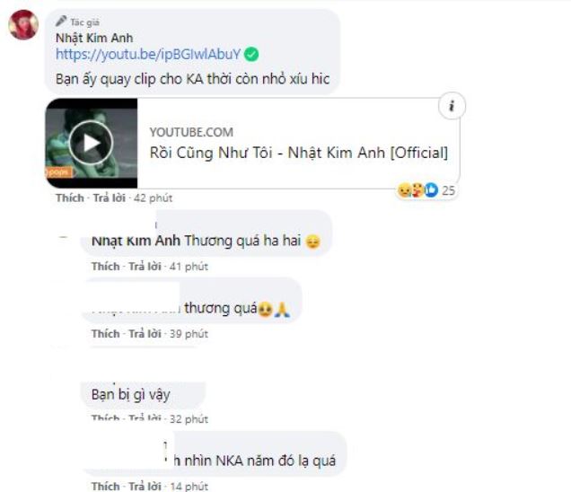 Dưới phần bình luận, Nhật Kim Anh còn tiết lộ nam diễn viên Đức Long đã từng đóng clip ca nhạc của cô từ lúc còn nhỏ. Điều này khiến nữ ca sĩ không khỏi xót xa khi nhận tin tang sự của ‘đàn em’: “Bạn ấy quay clip cho KA thời còn nhỏ xíu! Hic”