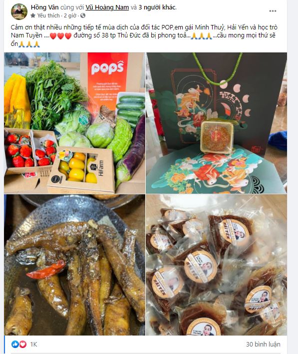 “Cám ơn thật nhiều những tiếp tế mùa dịch của đối tác POP, em gái Minh Thuỷ, Hải Yến và học trò Nam Tuyền ... đường số 38 TP Thủ Đức đã bị phong toả......cầu mong mọi thứ sẽ ổn.”