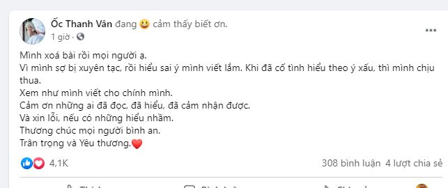 Theo đó, Ốc Thanh Vân tiết lộ cô phải xóa bài vì sợ quan điểm của mình bị xuyên tạc và gửi lời xin lỗi đến mọi người nếu như khiến khán giả hiểu nhầm. Bài đăng của nữ diễn viên đã khiến nhiều người không khỏi mủi lòng và đông viên bà xã Trí rùa:
