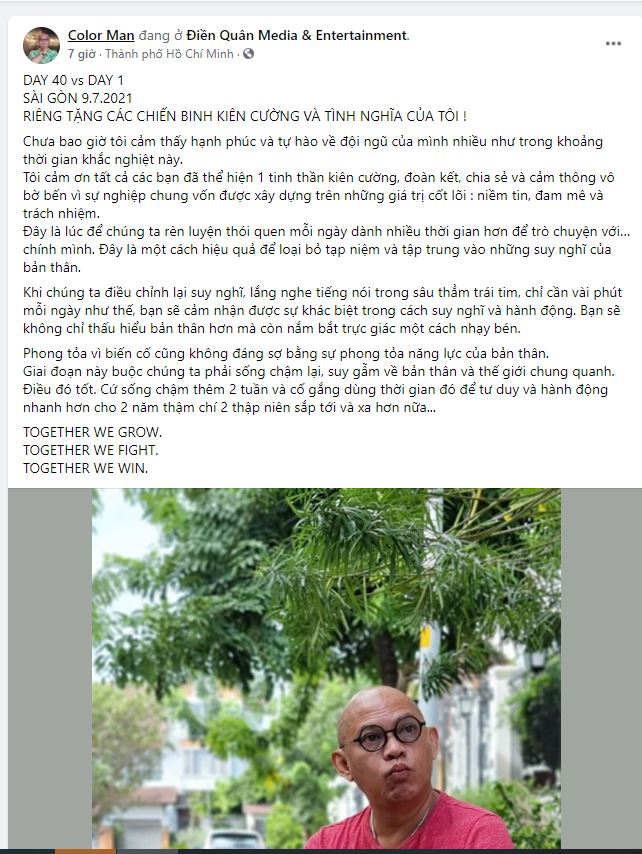 Đứng trước tin dữ việc quán gà mới chỉ khai trương một ngày đã phải tạm ngưng hoạt động vì thuộc diện phong tỏa, Color Man vẫn có những chia sẻ tích cực trên trang cá nhân: