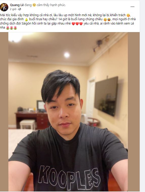 “Mái tóc kiểu vậy hợp không cả nhà ơi, lâu lâu up một hình mới nè, không lại bị khiển trách , chúc đại gia đình buổi trưa hay chiều? 14 giờ là buổi lưng chừng chiều, mọi người ở nhà chống dịch đợi Sàigòn hồi sinh ta lại gặp nhau nhé! yêu cả nhà, ai rảnh vào kênh xem Lê nha.”