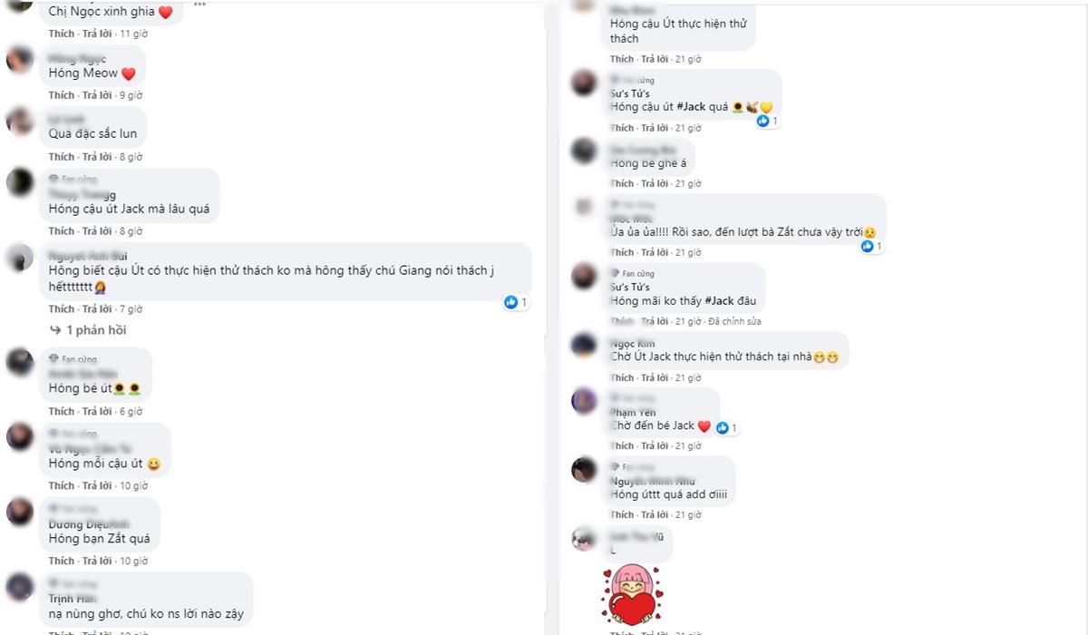 Nhiều người hâm mộ của Jack đã không khỏi băn khoăn và tỏ ra khó hiểu sao mãi chưa có thử thách cho thần tượng của mình: "Hông biết cậu Út có thực hiện thử thách không mà không thấy chú Giang nói thách gì hết!", "Sao mà xem hết của rất cả mọi người rùi mà lại ko có Jack vậy ?", "Jack có tham gia thử thách không ad ơi? Fan hóng cả tháng rồi, huhu". "Ủa ủa ủa!!!! Rồi sao, đến lượt bà Zắt chưa vậy trời"