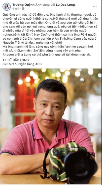"Quý ông anh này từ đó đến giờ, ổng lành tính, thương người, có chuyện gì cũng cười hềhề là xong.Hồi tháng 6 mới gởi ổng ít tiền nhờ đi giúp bà con mùa dịch.Ổng đi về xog còn gởi clip gởi hình cho xem rồi còn nói vui trong lòng quá, nếu có tiền nhiều hơn sẽ đi nhiều nữa vì “đi vào những con hẻm là còn nhiều người nghèo,bệnh tật lắm”. Nay CoVi ghé thăm,cả nhà ổng F0 4 người, vợ con anh ở Củ Chi, con trai lớn ở An Bình,ổng đang cấp cứu ở Nguyễn Trãi vì té xĩu… nghe mà xót ghê! Mà ổng mạnh mẽ lắm, sáng nay còn nhắn “anh ko sao,chỉ hơi mệt xíu thôi,em yên tâm”.Em cũng mong vậy anh nha.Ai quen biết a Long có thể phụ ảnh qua số tài khoản này ah." - Trương Quỳnh Anh đăng tải trên trang cá nhân.