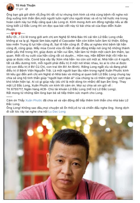 Cũng chính vì lý do này mà nhiều nghệ sĩ đang đăng tải bài viết kêu gọi hỗ trợ cho gia đình của Lữ Đắc Long.
