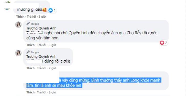 Theo đó, Trương Quỳnh Anh tiết lộ trong một bình luận là chính MC Quyền Linh là người giúp Lữ Đức Long chuyển về bệnh viện Chợ Rẫy.