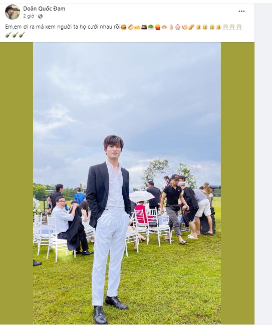 Mới đây, vào chiều ngày 13/7, nam diễn viên Doãn Quốc Đam đã chia sẻ hình ảnh đầy bảnh bao với bối cảnh tiệc cưới ngoài trời cùng dòng trạng thái: “Em, em ơi ra mà xem người ta họ cưới nhau rồi”.
