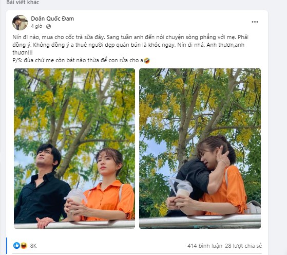 Đáng nói anh còn chia sẻ hài hước rằng sẽ ‘thuê người dẹp quán bún’ để đến được với Vân: “Nín đi nào, mua cho cốc trà sữa đây. Sang tuần anh đến nói chuyện sòng phẳng với mẹ. Phải đồng ý. Không đồng ý a thuê người dẹp quán bún là khóc ngay. Nín đi nhá. Anh thương, anh thương!!!