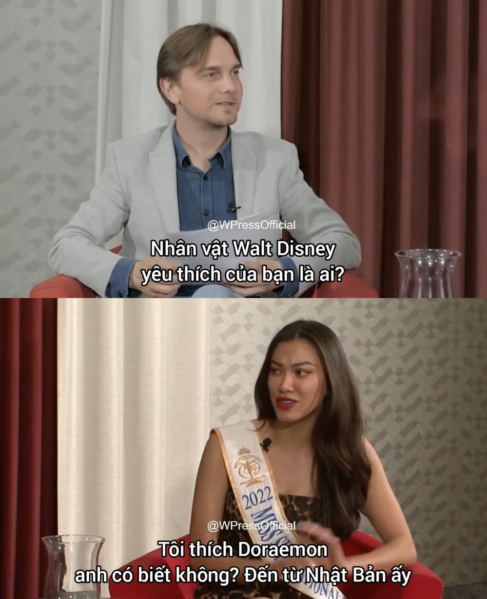 Mới đây, Á hậu Kim Duyên đại diện diện của Việt Nam tại cuộc thi Miss Supranational 2022 (Hoa hậu Siêu quốc gia 2022). Giữa lúc đang được đặt kỳ vọng từ người hâm mộ nước nhà, Kim Duyên lại gặp lỗi sai tai hại trong trò chuyện Supra chat 2. Theo đó, khi được MC hỏi: "Nhân vật hoạt hình nào của Disney mà bạn yêu thích nhất?". Kim Duyên đã ngay lập tức trả lời: "Tôi thích Doraemon. Bạn có biết không? Doraemon đến từ Nhật Bản."