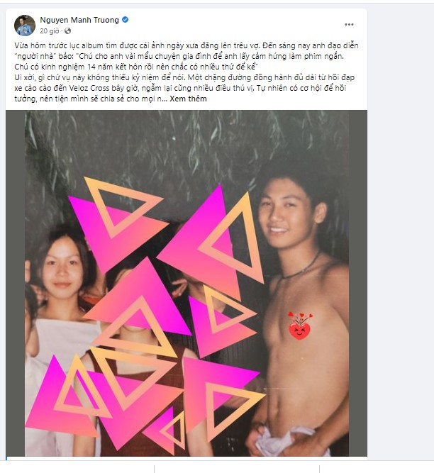 “Vừa hôm trước lục album tìm được cái ảnh ngày xưa đăng lên trêu vợ. Đến sáng nay anh đạo diễn “người nhà” bảo: "Chú cho anh vài mẩu chuyện gia đình để anh lấy cảm hứng làm phim ngắn. Chú có kinh nghiệm 14 năm kết hôn rồi nên chắc có nhiều thứ để kể”
