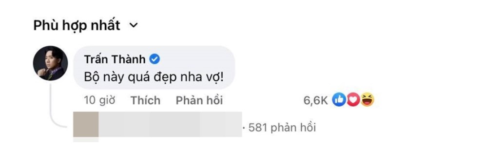 Tuy nhiên, tin đồn này nhanh chóng bị đập tan khi Trấn Thành đã để lại bình luận vô cùng yêu thương dưới bài đăng của vợ như “Bộ này quá đẹp nha vợ.”, “Chồng đi quay phinh, hắn thì enjoy đi xem phim!!!!! Tức hông!”...