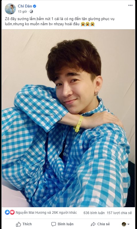 Đáng nói, nam ca sĩ Chi Dân tiết lộ rằng anh đã nhập viện rất lâu và chỉ mong đến ngày ra viện. Trước đó, Chi Dân cũng đã đăng tải khoảnh khắc nhún nhảy trong bệnh viện. Vì thời gian nhập viện đã được 2 tuần nên nhiều người hâm mộ càng thêm phần lo lắng không hiểu chi dân đang gặp phải vấn đề sức khỏe. Chi Dân cũng không chia sẻ gì thêm về tình hình sức khỏe của mình.