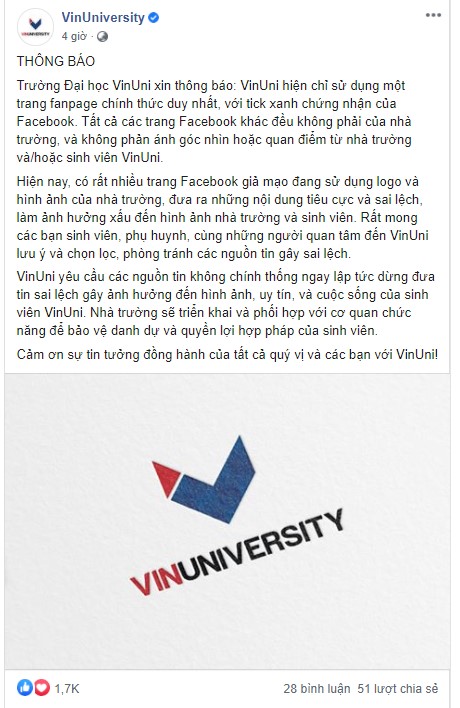 Mới đây, trang fanpage chính thức của trường đại học Trường Đại học VinUni – đại học tinh hoa và tư thục phi lợi nhuận đầu tiên tại Việt Nam đã chính thức lên tiếng về vụ việc bị một trang fanpage khác giả mạo và đăng những thông tin sai sự thật.