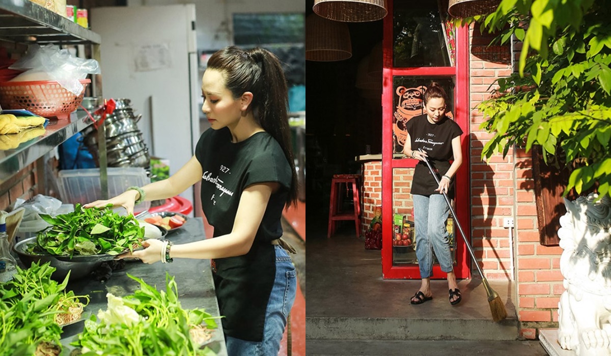 Ánh Linh ăn mặt giản dị phụ giúp quán ăn gia đình