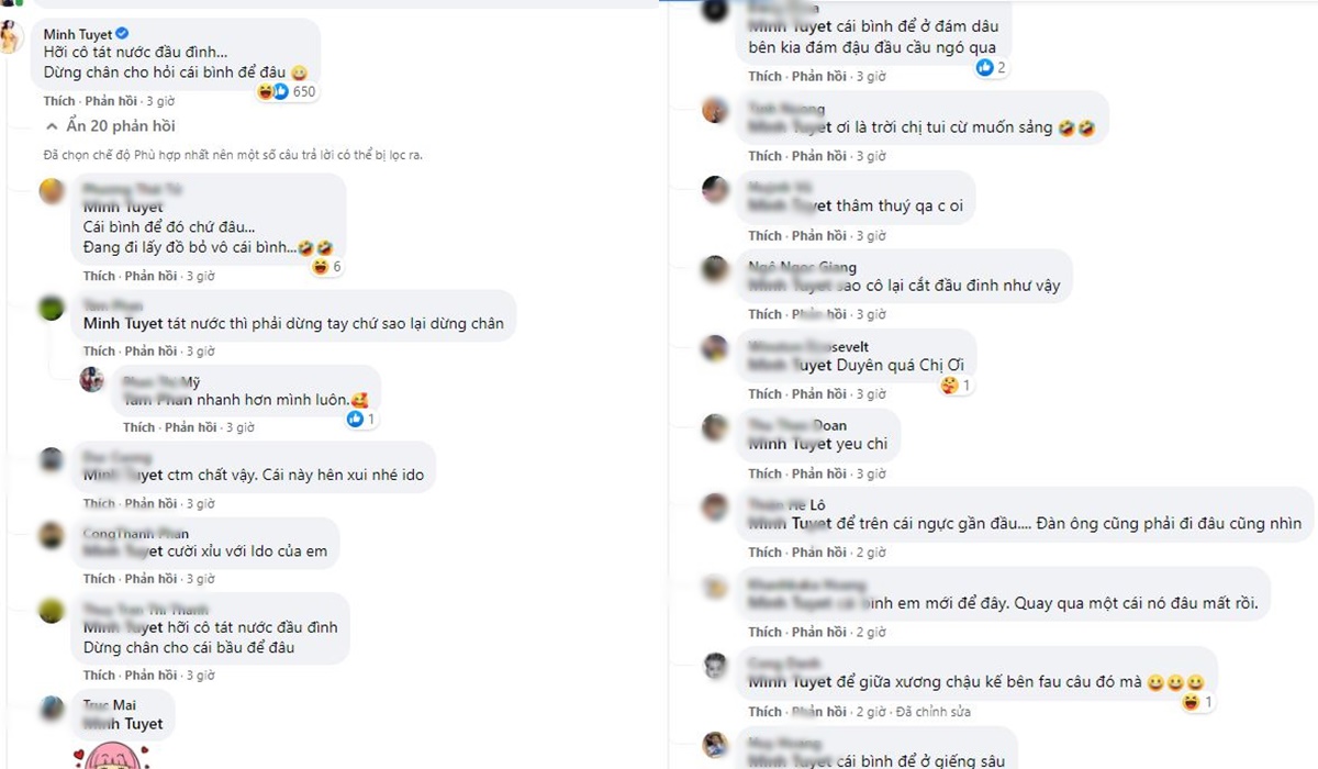 Đáng nói, phần bình luận còn xuất hiện ‘màn đối thơ’ của nữ ca sĩ Minh Tuyết: “Hỡi cô tát nước đầu đình…/Dừng chân cho hỏi cái bình để đâu”. Ngay lập tức câu thơ của nữ ca sĩ đã khiến nhiều người vô cùng thích thú vì cho rằng Minh Tuyết có ẩn ý vô cùng thâm thúy mà không kém phần hài hước.