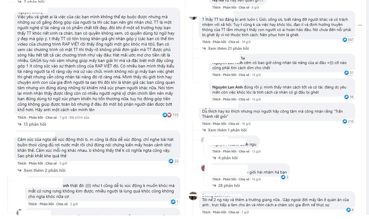 “Tôi thấy TT không đáng bị anti luôn ý. Giỏi, sống ok, biết nâng đỡ người khác và có trách nhiệm với xã hội. Tuy tôi cũng không ưa việc hay khóc lóc, đạo lí và định hướng truyền thông của TT lắm nhưng tôi thấy con người có ai hoàn hảo đâu. Nó chưa đến nỗi phải bị ghét ấy vì nó thuộc tính cách. Nên phục hơn là ghét.”