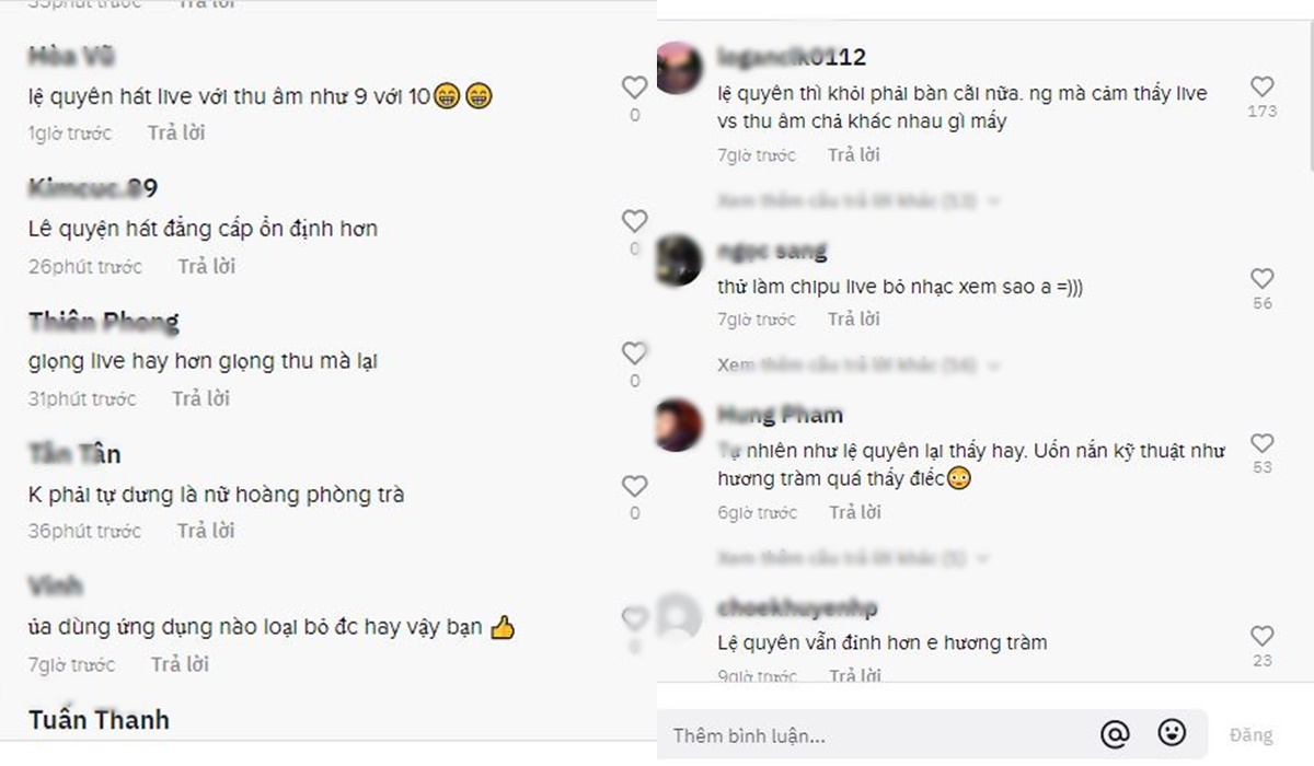Nhiều lời khen dành cho giọng hát xuất sắc của Lệ Quyên: "Lệ Quyên hát live với thu âm như 9 với 10", "Lệ Quyên thì khỏi phải bàn cãi nữa, người mà cảm thấy live với thu âm chả khác gì nhau mấy", "Lệ Quyên hát đẳng cấp ổn định hơn", "Giọng live hay hơn giọng thu mà lại"