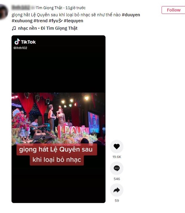 Theo đó, vào ngày 13/8, tài khoản này tiếp tục đăng tải clip ‘bóc trần’ giọng hát của nữ ca sĩ Lệ Quyên với mô tả: “Giọng hát Lệ Quyên sau khi loại bỏ nhạc sẽ như thế nào?”