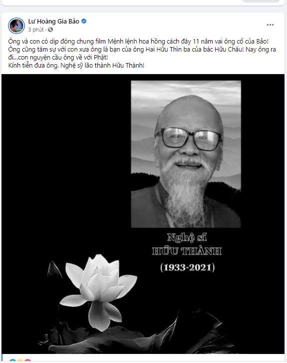 Vào chiều 1-8, ngay sau khi biết tin, diễn viên Lư Hoàng Gia Bảo - con trai nuôi của Hoài Linh đã vô cùng xót xa và chia sẻ bài viết thể hiện sự ‘thành kính phân ưu’ với nam nghệ sĩ lão làng: “Ông và con có dịp đóng chung film Mệnh lệnh hoa hồng cách đây 11 năm vai ông cố của Bảo! Ông cũng tâm sự với con xưa ông là bạn của ông Hai Hữu Thìn ba của bác Hữu Châu! Nay ông ra đi…con nguyện cầu ông về với Phật!
