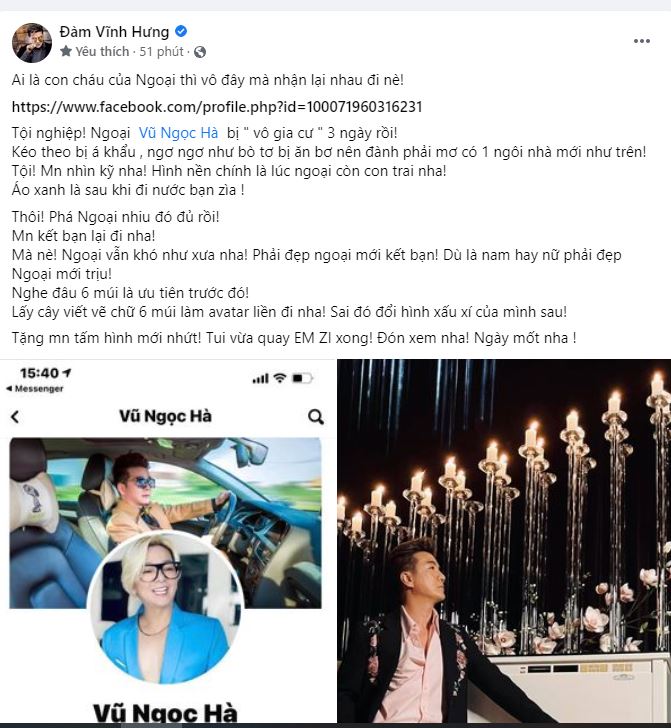 Mới đây, vào ngày 21/8, Đàm Vĩnh Hưng đã bất ngờ đăng tải bài viết, thông báo về việc nam ca sĩ Vũ Hà bị mất tài khoản Facebook và đính chính tài khoản mới để mọi người kết bạn lại.