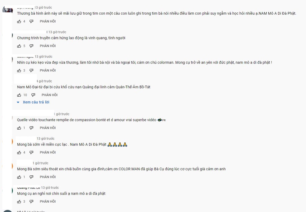 “Mong Bà sớm siêu thoát xin chia buồn cùng gia đình,cảm ơn COLOR MAN đã giúp Bà Cụ đúng lúc cơ cực tuổi già cảm ơn anh!”