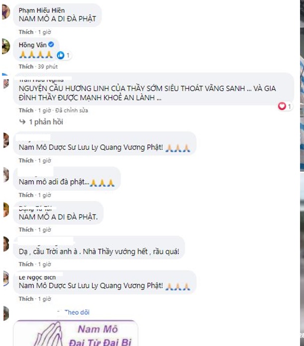 Ở dưới bình luận nhiều nghệ sĩ như NSND Hồng Vân, Hiếu Hiền đã cũng gửi lời cầu nguyện cho gia đình của người thầy đáng kinh.