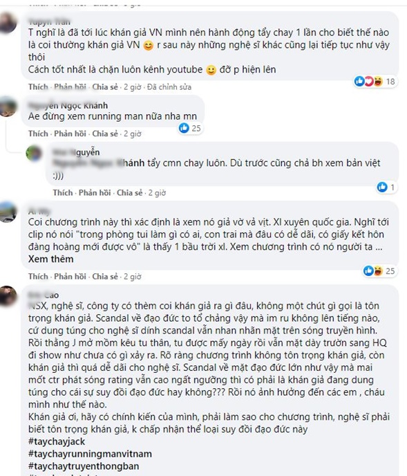 Giữa lúc lùm xùm của Jack diễn ra, hàng loạt khán giả của Running Man VN đã tạo ra làn sóng tẩy chay, yêu cầu Running Man VN mùa 2 loại Jack ra khỏi dàn thành viên, nếu không sẽ tẩy chay luôn cả gameshow này. Thậm chí, nhiều người còn yêu cầu BTC thay thế Jack bằng BB Trần và Trấn Thành- 2 nghệ sĩ đã gây được tiếng vang ở mùa 1 nhưng lại bị gạch tên ở mùa mới.