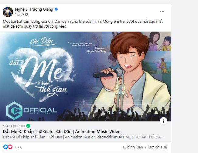 Mới đây, Trường Giang đã chia sẻ lên trang fanpage của mình bài hát mới của Chi Dân và động viên đàn em vượt qua nỗi đau: “Một bài hát cảm động của Chi Dân dành cho Mẹ của mình. Mong em trai vượt qua nỗi đau mất mát để sớm quay trở lại với công việc.”