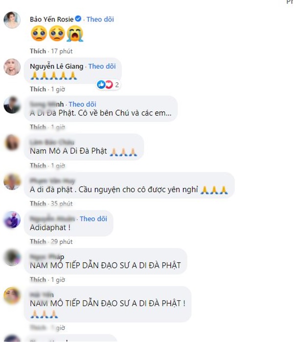 Dưới bài viết, nhiều nghệ sĩ và đồng nghiệp trong đó có nghệ sĩ Lê Giang đã đồng loạt cầu nguyện cho nữ nghệ sĩ quá cố.