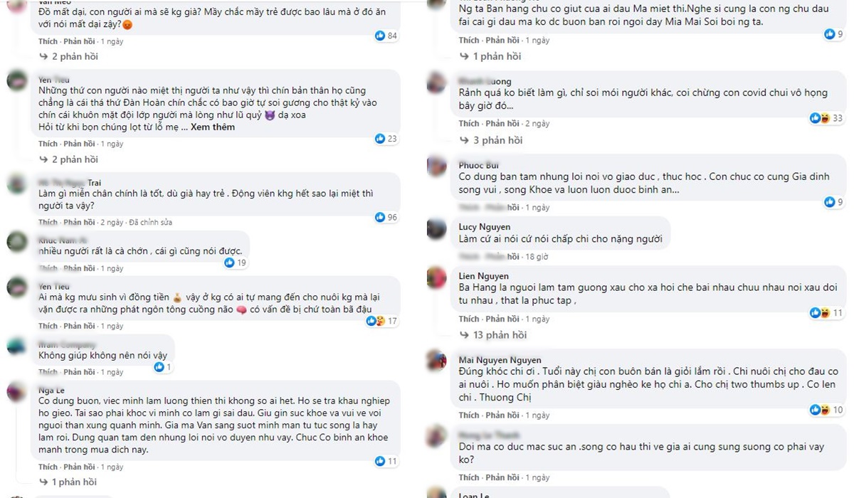 “Mình buôn bán mà, chứ đâu có xòe tay xin tiền họ đâu ? Chị đừng có buồn nha chị, giữ gìn sức khỏe nha chị!“Đừng khóc chị ơi. Tuổi này chị con buôn bán là giỏi lắm rồi. Chi nuôi chị chớ đâu có ai nuôi. Họ muốn phân biệt giàu nghèo kệ họ chị ạ. Cố lên chị!”