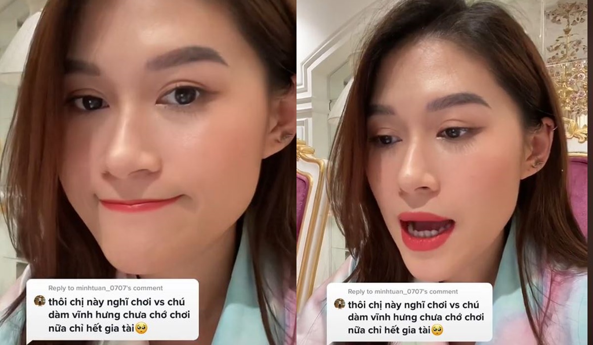 Có thể thấy Ngọc Thanh Tâm đã dùng chính 2 bình luận của cư dân mạng khác để đáp trả một cách ‘xanh rờn’ cùng với biểu cảm khuôn mặt ‘ngao ngán’ trước những lời châm chọc mối quan hệ giữa cô cùng với Đàm Vĩnh Hưng.