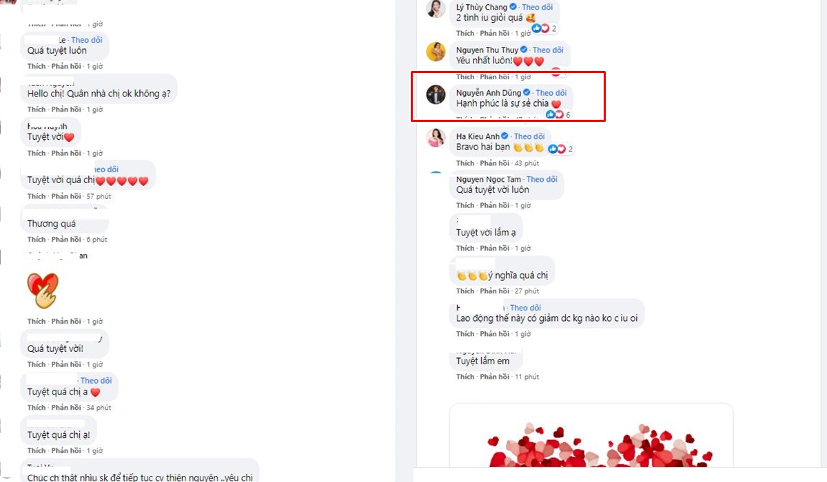 Ở phần bình luận, Anh Dũng cũng có bình luận đáng chú ý thể hiện tinh thần vì cộng đồng của mình: “Hạnh phúc là sự sẻ chia!”.Có thể thấy dù công khai mối quan hệ tình cảm cách nhau đến 14 tuổi nhưng cả Trương Ngọc Ánh và Anh Dũng đều có cách thể hiện tình cảm vô cùng kín tiếng và luôn xuất hiện với hình ảnh tích cực, gây thiện cảm với khán giả.