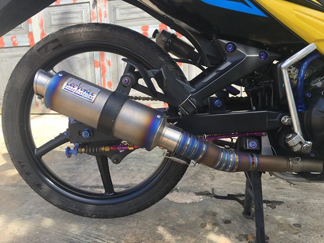 Phần bô là sự kết hợp giữa hai thương hiệu Leovince mod Titan: cổ pô 3 khúc dễ dàng tháo ráp và căn chỉnh trong quá trình sử dụng, kết cấu khá thoáng, mang lại âm thanh uy lực.