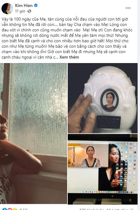 Đến nay đã tròn 100 ngày mẹ mất nhưng cô vẫn khỏi xót xa khi vẫn chưa thể về Việt Nam. Mới đây, nữ diễn viên đã đăng tải những dòng tâm sự đầy xúc động đến người mẹ quá cố: "Vậy là 100 ngày của mẹ, tận cùng của nỗi đau của người con tới giờ vẫn không tin mẹ đã rời con.... bàn tay cha chạm vào mẹ! Lòng con đau xót vì chính con cũng muốn chạm vào mẹ! Mẹ ơi! Con đang khóc nhưng sẽ không rơi dòng nước mắt để mẹ yên tâm mọi thứ! Nhưng con biết mẹ đã cạnh và cho con nhiều hơn bao giờ hết! Mọi thứ cho con như mẹ từng muốn! Mẹ bảo vệ con bằng cách cho con thấy và chạm vào khi không ổn! Giờ con biết mẹ đi nhưng mẹ sẽ cạnh con cạnh cháu ngoại vì căn nhà con sống ấm áp hơn bao giờ hết! Con chỉ có mẹ duy nhất và mãi mãi! Mẹ ơi!".