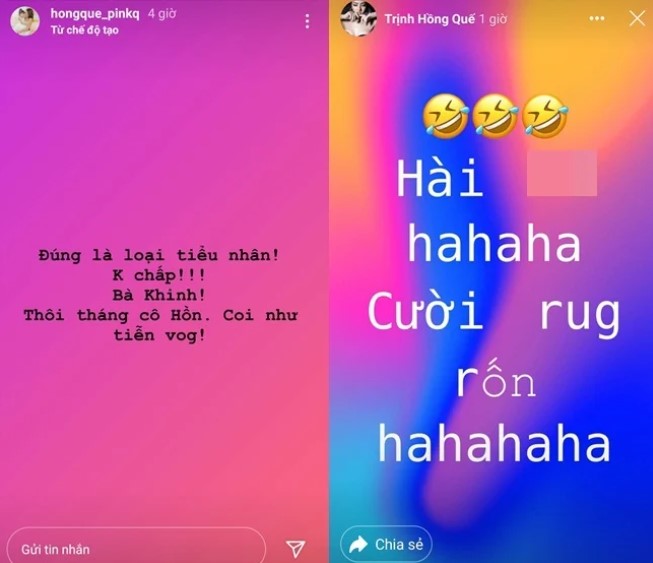 Trước lời đáp trả của Hương Trần, nữ người mẫu Hồng Quế cũng không chịu nhường bước khi đăng tải trạng thái "Hài, cười rung rốn", "Đúng là loại tiểu nhân! Không chấp! Bà khinh!".