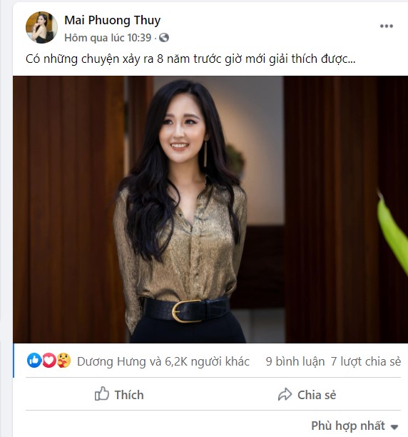 Mới đây, vào sáng ngày 11/9, Mai Phương Thúy đã đăng tải một bức ảnh cười rạng rỡ với dòng trạng thái: “Có những chuyện xảy ra 8 năm trước giờ mới giải thích được…”. Dòng trạng thái này cho thấy tâm trạng thoải mái của mình sau khi lên tiếng sự thật về scandal 8 năm trước.