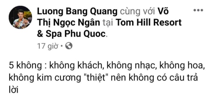 Mới đây nhất, trên trang cá nhân của mình, Lương Bằng Quang tiếp tục chia sẻ thêm về buổi cầu hôn bạn gái. Đáng nói, nam nhạc sĩ thẳng thắn thừa nhận 4 lý do khiến Ngân 98 từ chối lời cầu hôn của mình:"5 không: Không khách, không nhạc, không hoa, không kim cương 'thiệt' nên không có câu trả lời..."