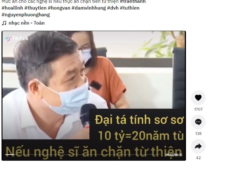 Mới đây đoạn clip được cắt ra từ chương trình tọa đàm trên khi Đại tá, TS, luật sư Lê Ngọc Khánh cung cấp thông tin về mức án hình sự áp dụng với hành vi ăn chặn tiền quyên góp từ thiện: “Các nghệ sĩ có đủ căn cứ là chiếm đoạt, là phải có hành vi chiếm đoạt. Chẳng hạn như người ta gửi cho anh 10 tỷ, anh chỉ chi có 5 tỷ, 5 tỷ đút túi cá nhân mà anh tiêu, đó là hành vi chiếm đoạt thì dứt khoát là phạm tội rồi. Là đi tù đấy. Mà tội lừa đảo, lạm dụng tín nhiệm lên đến tận 20 năm tù đấy. Cho nên các nghệ sĩ luôn phải nghĩ rằng nếu như làm không cẩn thận, nếu không đúng quy định thì rất dễ vi phạm pháp luật.”