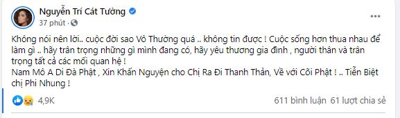 Thông tin này khiến không chỉ khán giả mà cả giới showbiz vô cùng bàng hoàng và không tin nổi khi chỉ cách đây 2 ngày tài khoản có tick xanh của Phi Nhung (có người quản lý) đã đăng tải bác bỏ các tin đồn xấu và khẳng định nữ ca sĩ vẫn đang tiếp tục điều trị.