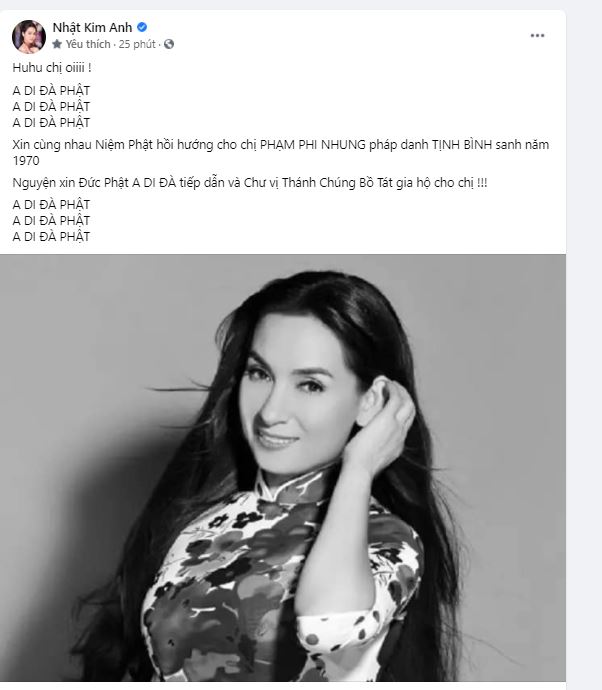 Nữ ca sĩ Nhật Kim anh cũng có bài đăng rơi nước mắt khi chia sẻ hình ảnh đen trắng của Phi Nhung và cầu nguyện cho đàn chị: “Huhu chị ơi!