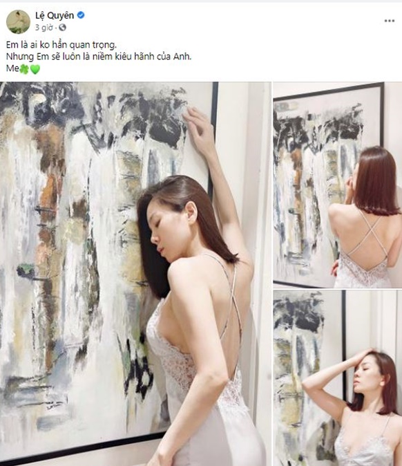 Mới đây, vào ngày 9/8, Lệ Quyên lại khiến dân tình đứng ngồi không yên khi khoe loạt ảnh đầy quyến rũ với dòng trạng thái ngập tràn ‘tình yêu’: “Em là ai ko hẳn quan trọng.Nhưng Em sẽ luôn là niềm kiêu hãnh của Anh.Me.”