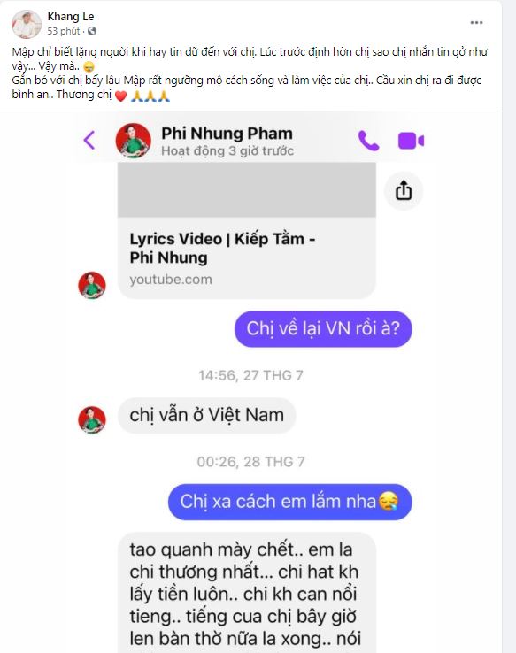 Theo đó, trong một tin nhắn vào ngày 28/7, Minh Khang có trách nhẹ đàn chị ‘lạnh nhạt’ với mình nên Phi Nhung đã ‘mắng yêu’ nam nhạc sĩ một cách đầy hài hước: “Tao quánh mày chết.. Em là chị thương nhất. Chị hát không lấy tiền luôn. Chị không cần nổi tiếng...tiếng của chị bây giờ lên bàn thờ nữa là xong...nói chị quen em chị giận em à thằng mập”.