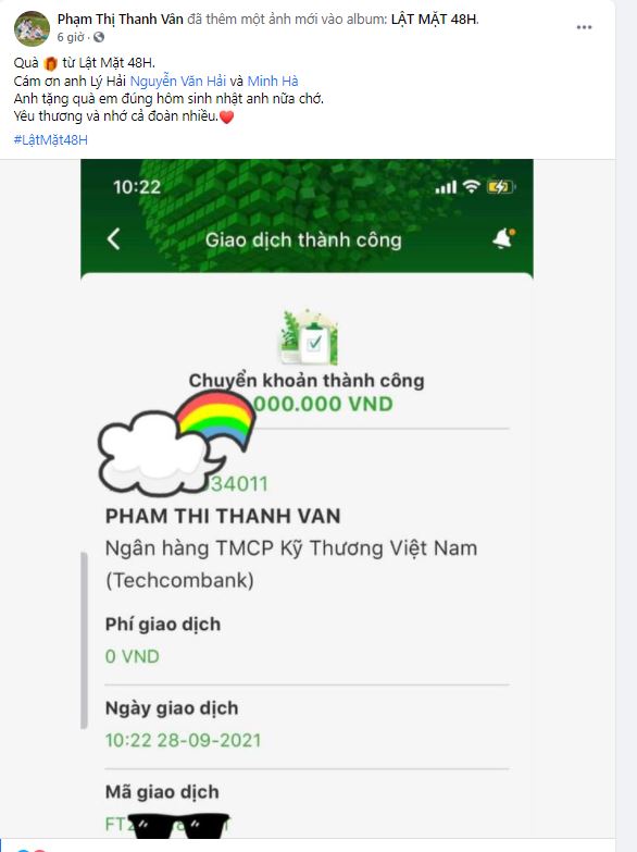 Theo đó vào đúng sinh nhật Lý Hải, nam MC này đã chuyển khoản số tiền thưởng sau thành công của phim Lật Mặt 5. Dù đã tinh ý che số tiền được vợ chồng Lý Hải, Minh Hà chuyển khoản, nhưng dân tình cũng đoán được khoản thưởng của Ốc Thanh Vân không hề nhỏ.