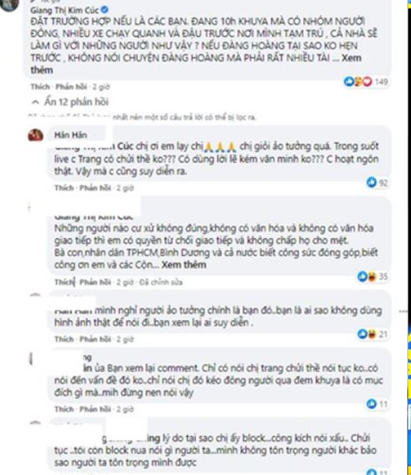 Đáng nói, dưới phần bình luận, Giang Kim Cúc còn nói rõ lý do khiến mình không ra gặp khi nữ mạnh thường quân tìm đến tận nơi: “Đặt trường hợp nếu là các bạn. Đang 10 giờ khuya mà có nhóm người đông, nhiều xe chạy quanh và đậu trước nơi mình tạm trú, cả nhà sẽ làm gì với những người như vậy? Nếu đang hoàng tại sao không hẹn trước, không nói chuyện đàng hoàng mà phải rất nhiều tài khoản livestream từ nhà của hộ qua tới đây quay phim chụp hình nơi nhóm đang sinh hoạt? Các bạn đi nhiều nhóm mục đích là gì? Hiện nhà nước đang gồng mình chống dịch mà các bạn bao nhiêu người và bên tôi bao nhiêu người? Tập hợp lại để khẩu chiến lớn tiếng. Lớn tiếng cho cộng đồng mạng sao? Tôi không hiểu đó là hành vi của người làm từ thiện, nhà hảo tâm chân chính hay là nhóm đang áp đảo tinh thần của tôi và đồng đội tôi."