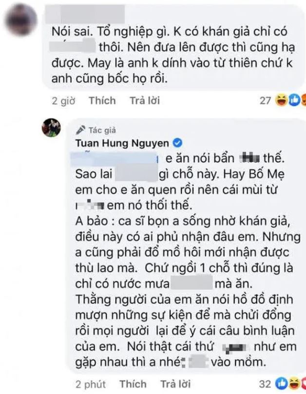 Bình luận đầu công kích được nhắm tới Tuấn Hưng: "Nói sai, Tổ Nghiệp gì. Không có khán giả chỉ có *** thôi, may anh không dính vào từ thiện chứ không cũng bóc họ anh rồi".